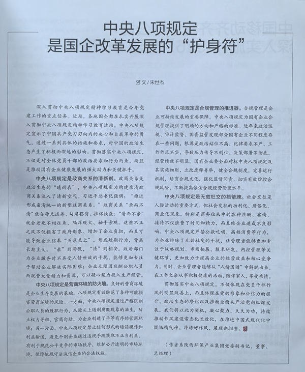 日前出版的《國企》雜志刊發(fā)了陜西環(huán)保集團黨委副書記、董事、總經(jīng)理宋世杰同志文章《中央八項規(guī)定是國企改革發(fā)展的“護(hù)身符”》?,F(xiàn)刊載如下,以饗讀者。